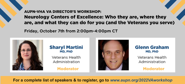 We will host our Second Annual Virtual Workshop for VA Neurology Directors on Friday, October 7 from 2pm - 4pm CT. This workshop will focus on “Neurology Centers of Excellence: What they can do for you and the Veterans you serve.” The session will describe the services offered by the VHA-funded Centers of Excellence (COEs) in Parkinson’s Disease, Multiple Sclerosis, Epilepsy and Headache, followed by discussion about how the COE can better serve VA patients. The session will be hosted by Dr. Sharyl Martini (Baylor) and Dr. Glenn Graham, both affiliated with the Veterans Health Administration. Registration is free!